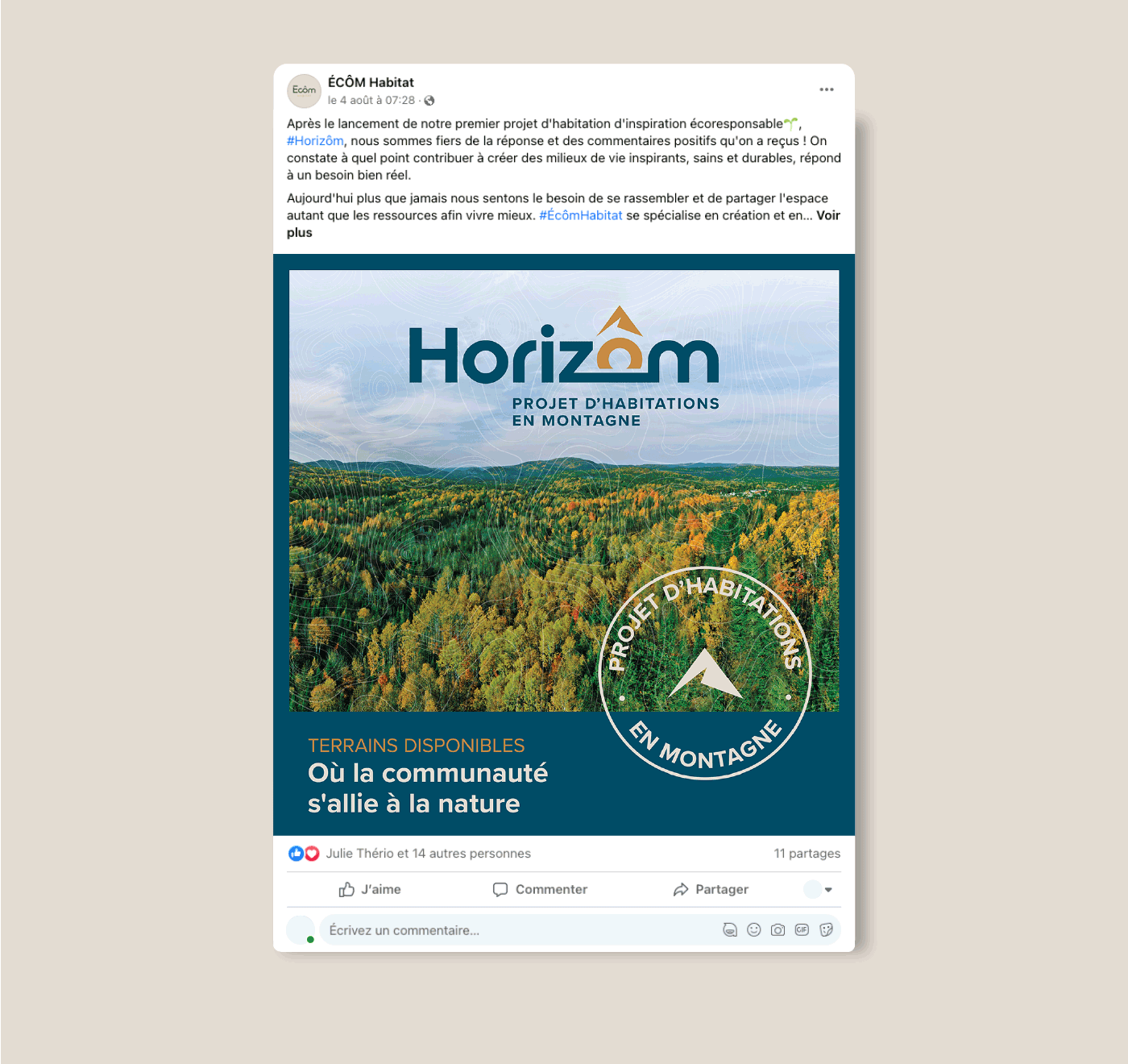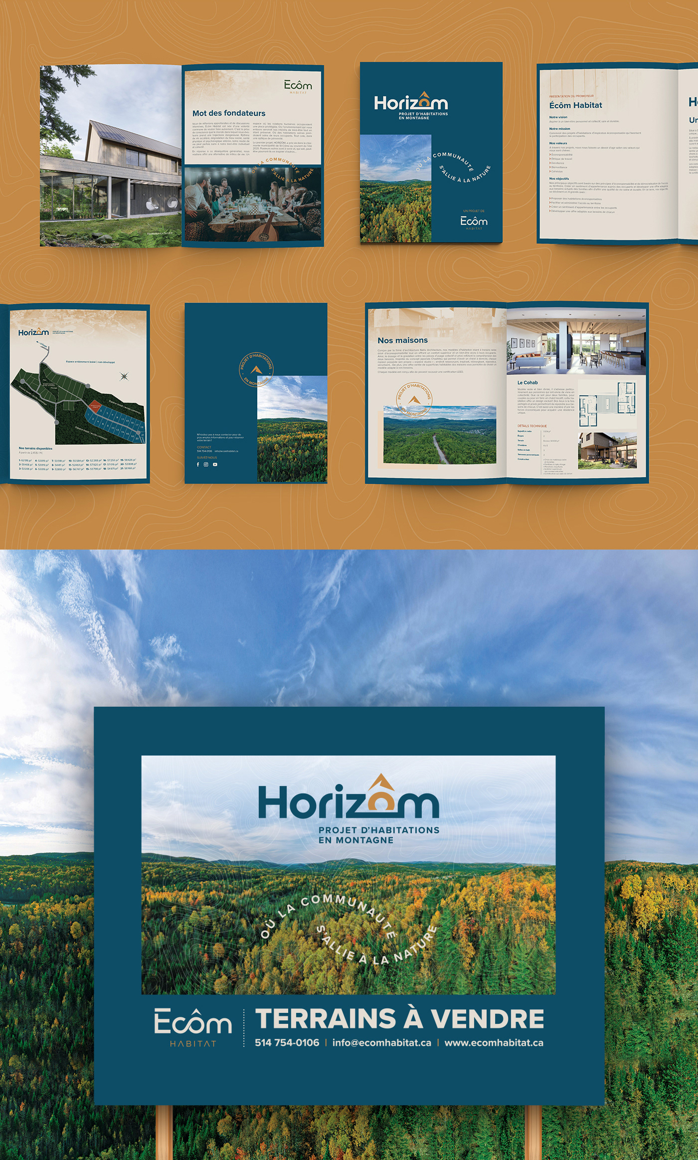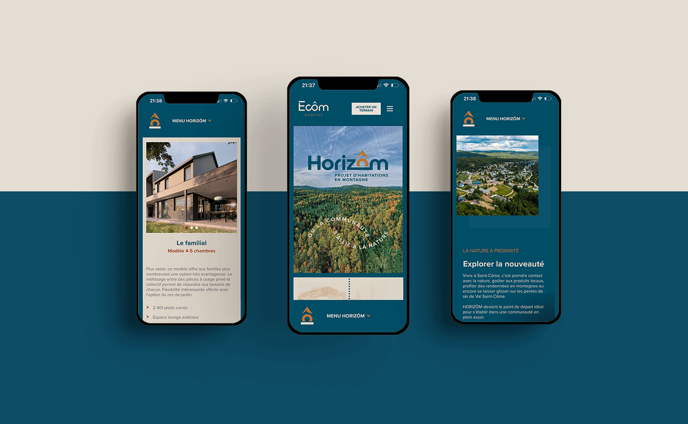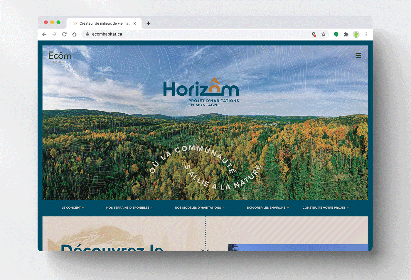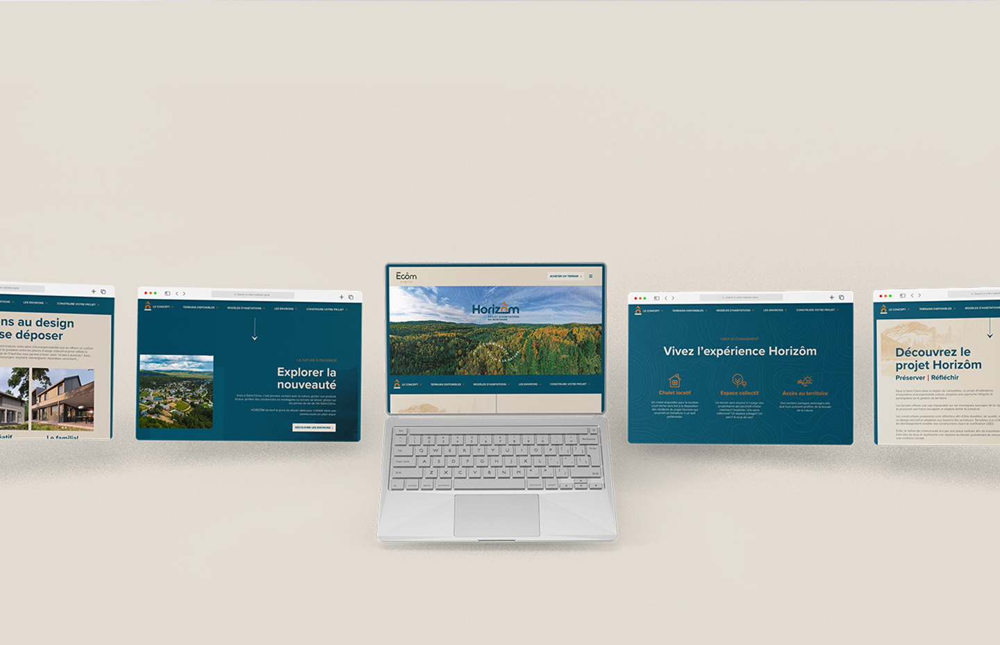 Quant au Web, une section propre à Horizôm a été intégrée à même le site d’Écom Habitat. Un défi à la fois au niveau du UX et du développement Web pour que les deux entités vivent au sein d’une même plateforme. Le site a été développé avec la technologie Statamic.